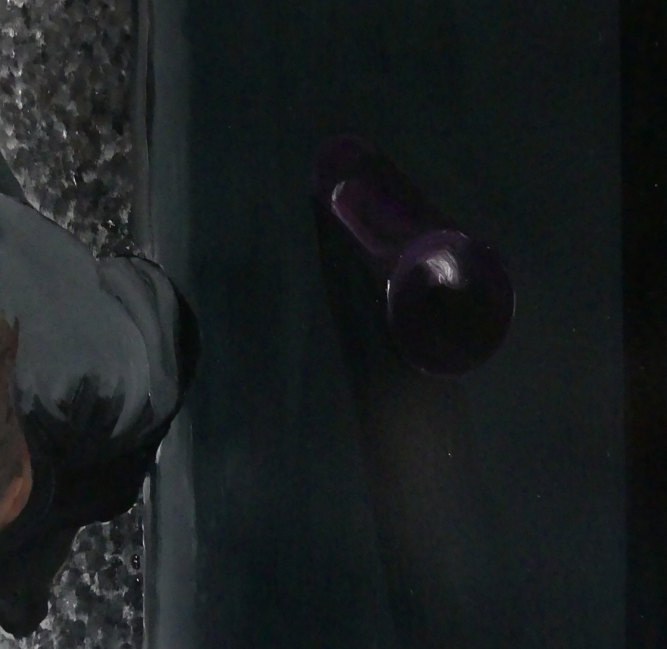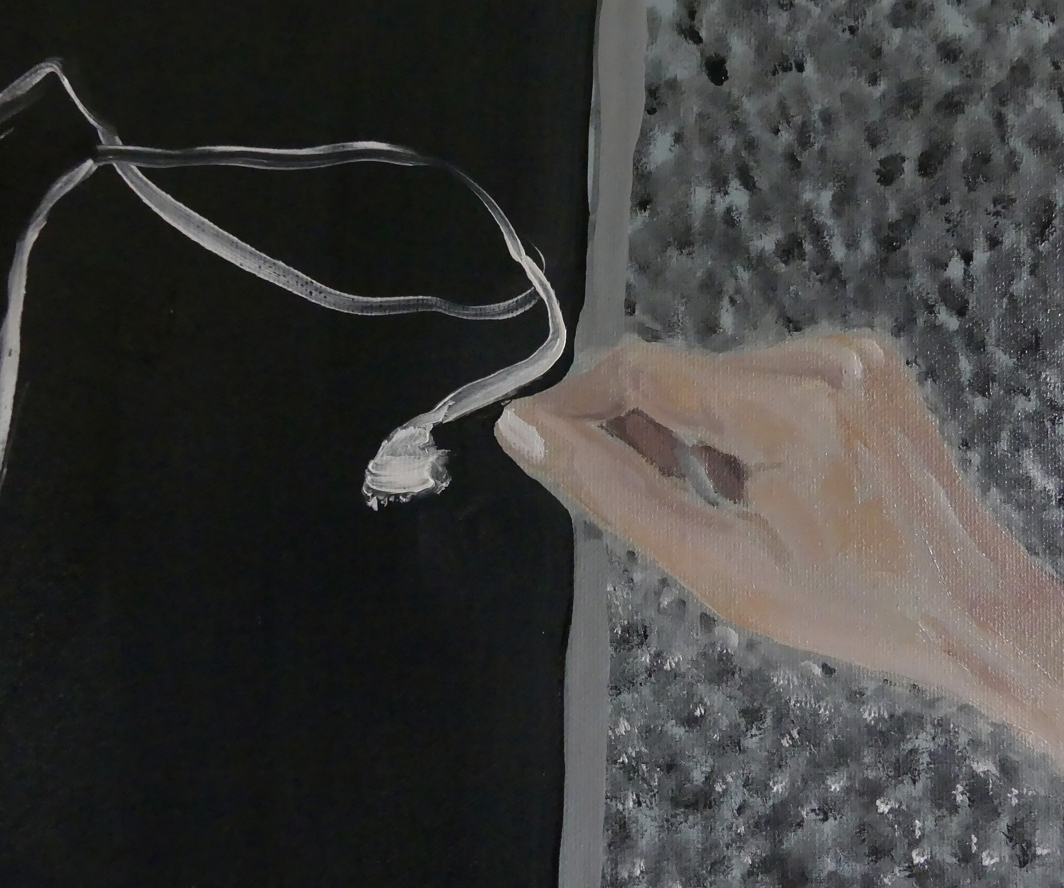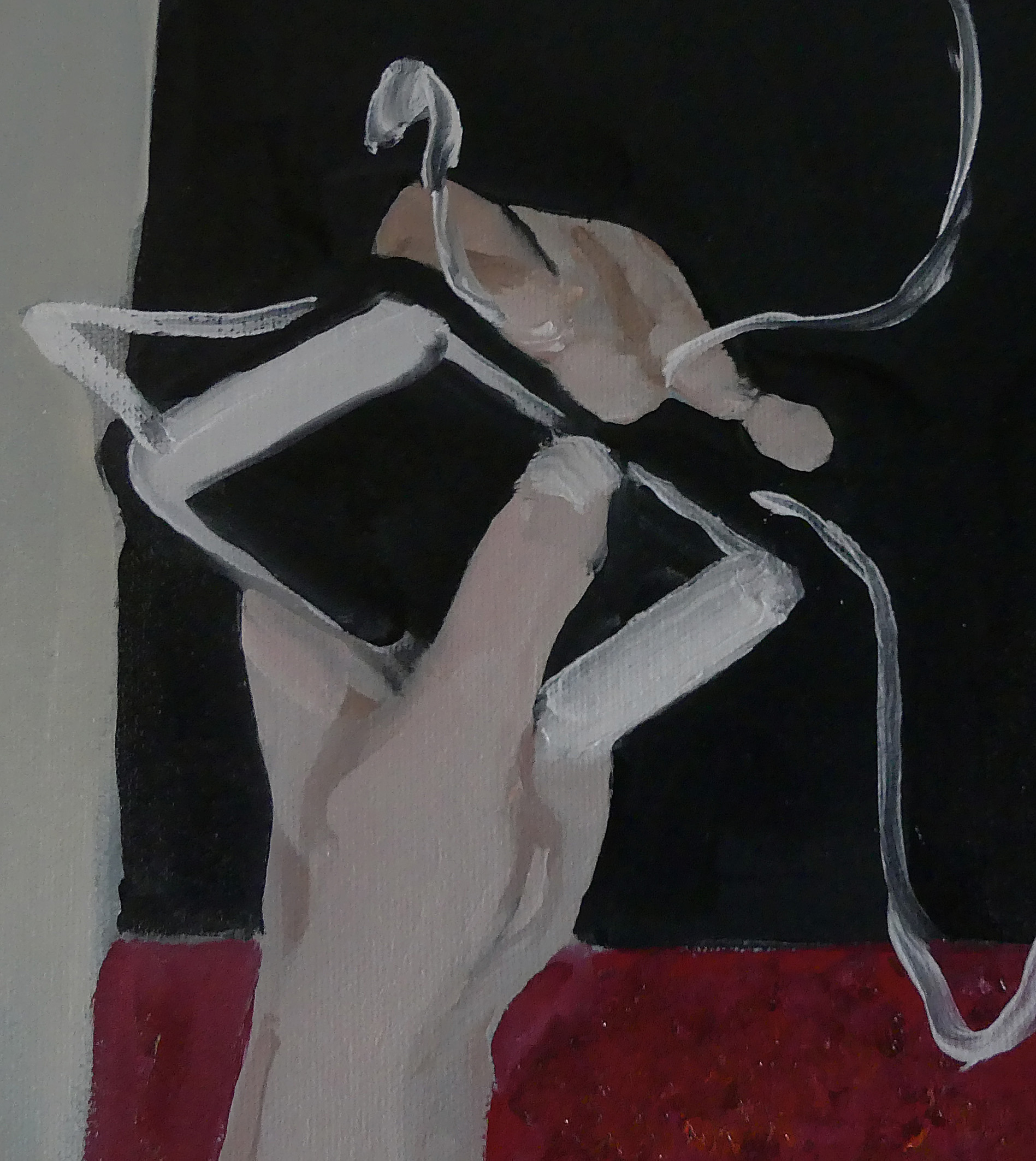 J’ai toujours un mini appareil photo dans la poche, même quand je suis nu. Dans la chambre d’un gîte à Périgueux où je passais la nuit, j’ai vu une femme attrapant la serviette pour sortir d’une douche à l’italienne. La femme au bain est un sujet « classique ». La douche qui se montre dans une cache de verre, une fantaisie contemporaine. Le contre-jour réfléchi fait exister la scène. La silhouette du photographe, croisant le corps en extension dans le reflet des rideaux, érotise la situation. La peinture vient donner l’irréalité nécessaire pour laisser vaguer le désir. Ce n’est sans doute rien d’autre, le réalisme en peinture.
