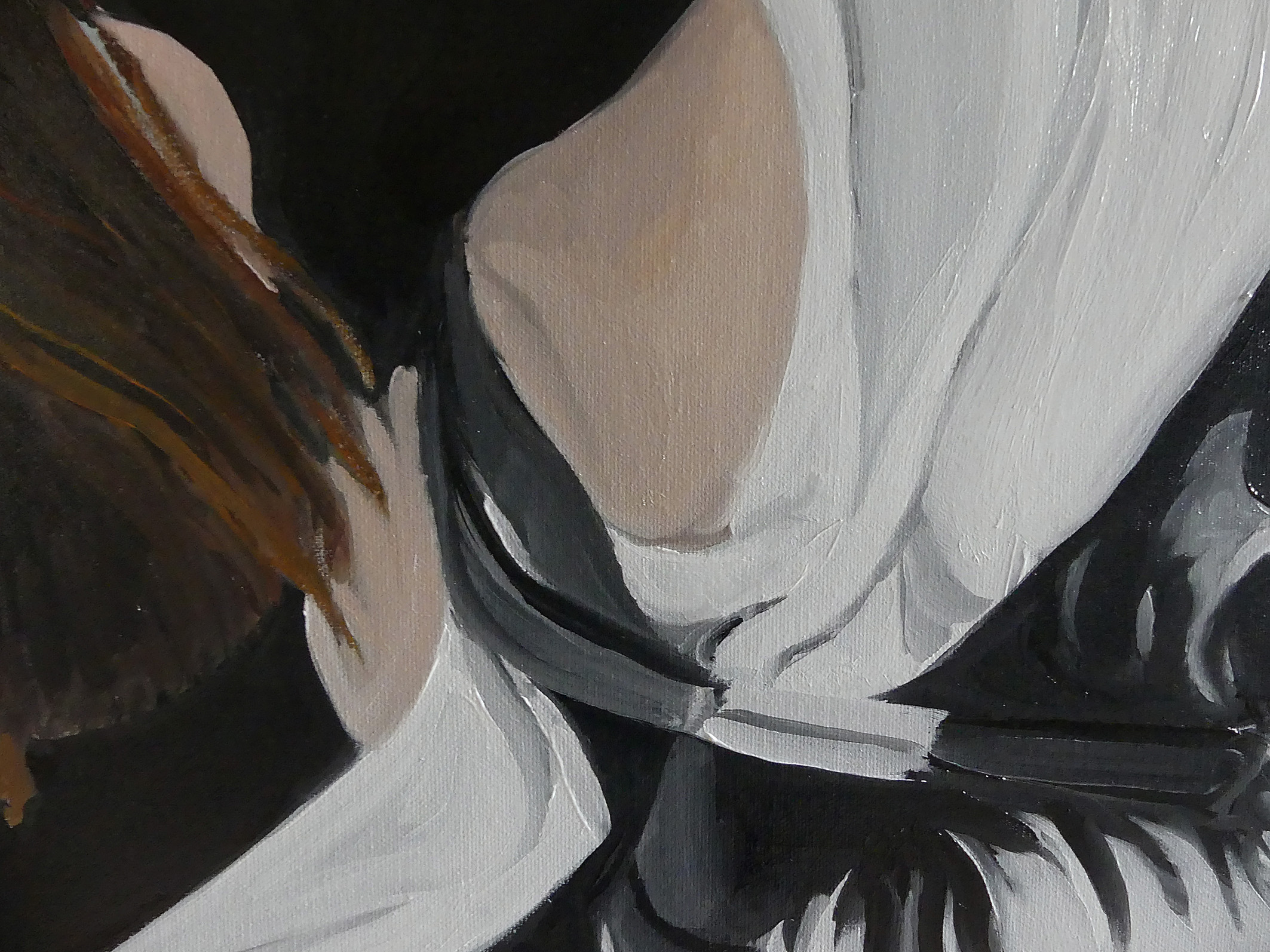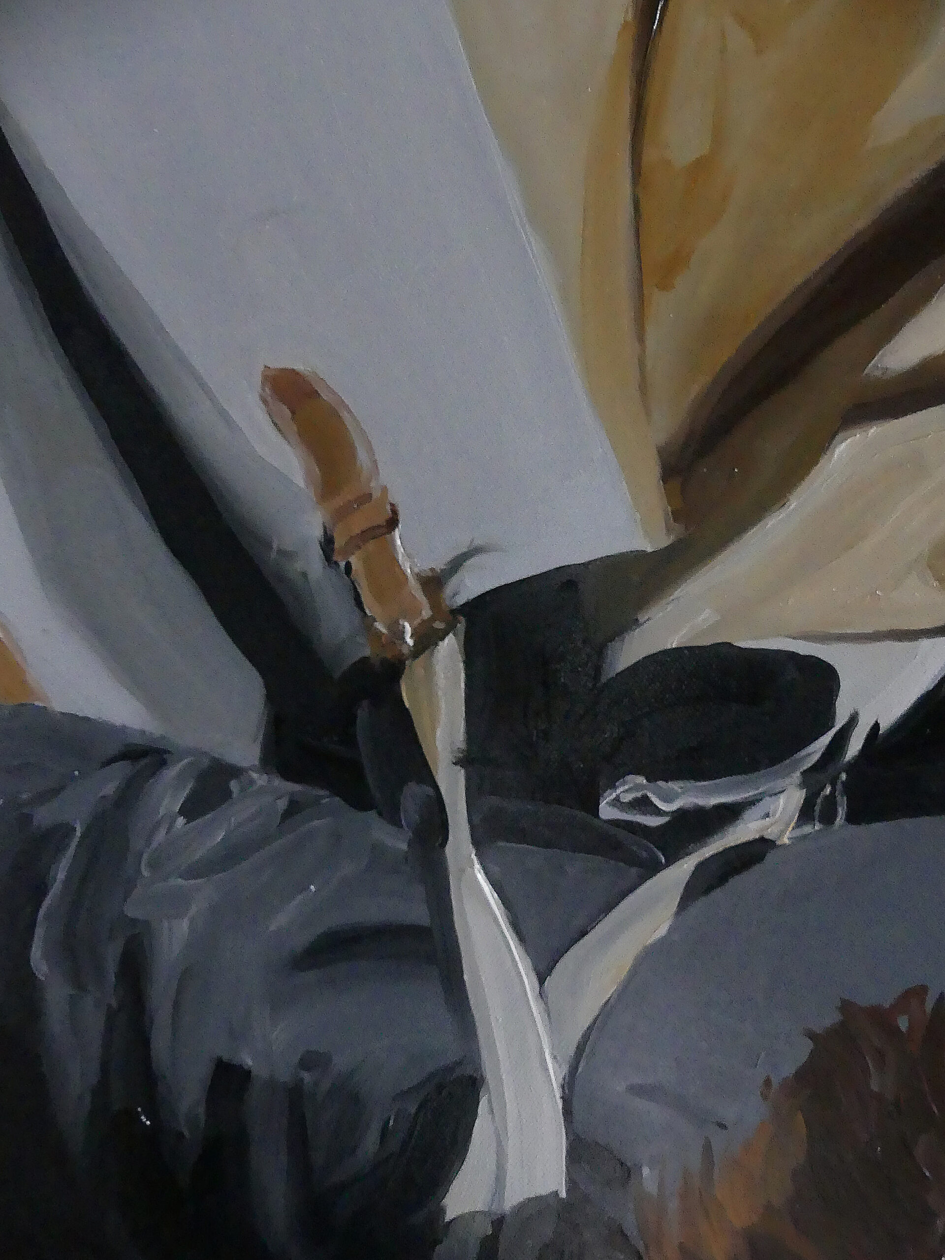 Lucie a manifestement posé. Mais pas pour moi. Pour un ou une photographe sans doute – je n’ai pas trouvé l’auteur(e) -, car la lumière qui l’éclaire ressemble fort à celle d’un flash. Elle découpe le volume et fait briller la peau. D’ailleurs, si l’on s’approche du tableau, on distingue dans le reflet de l’objectif de l’appareil photo posé sur la commode, le dispositif d’éclairage, les parapluies et la personne qui shoote! Dans cette chambre d’hôtel qui me rappelle celles de l’hôtel Sevilla à la Havane, Lucie m’a montré ce corps monstrueux et splendide qui donne la vie.