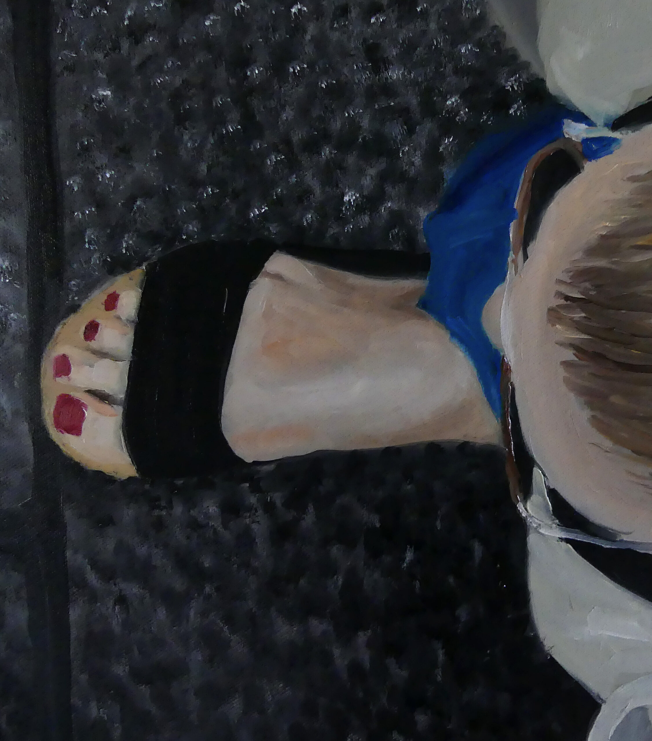 Une randonnée en montagne m’a donné deux tableaux. Celui-ci et „Parmi les pierres“, un nu de plus grand format. Le challenge, c’était la roche et le plaisir manifeste de la randonneuse.