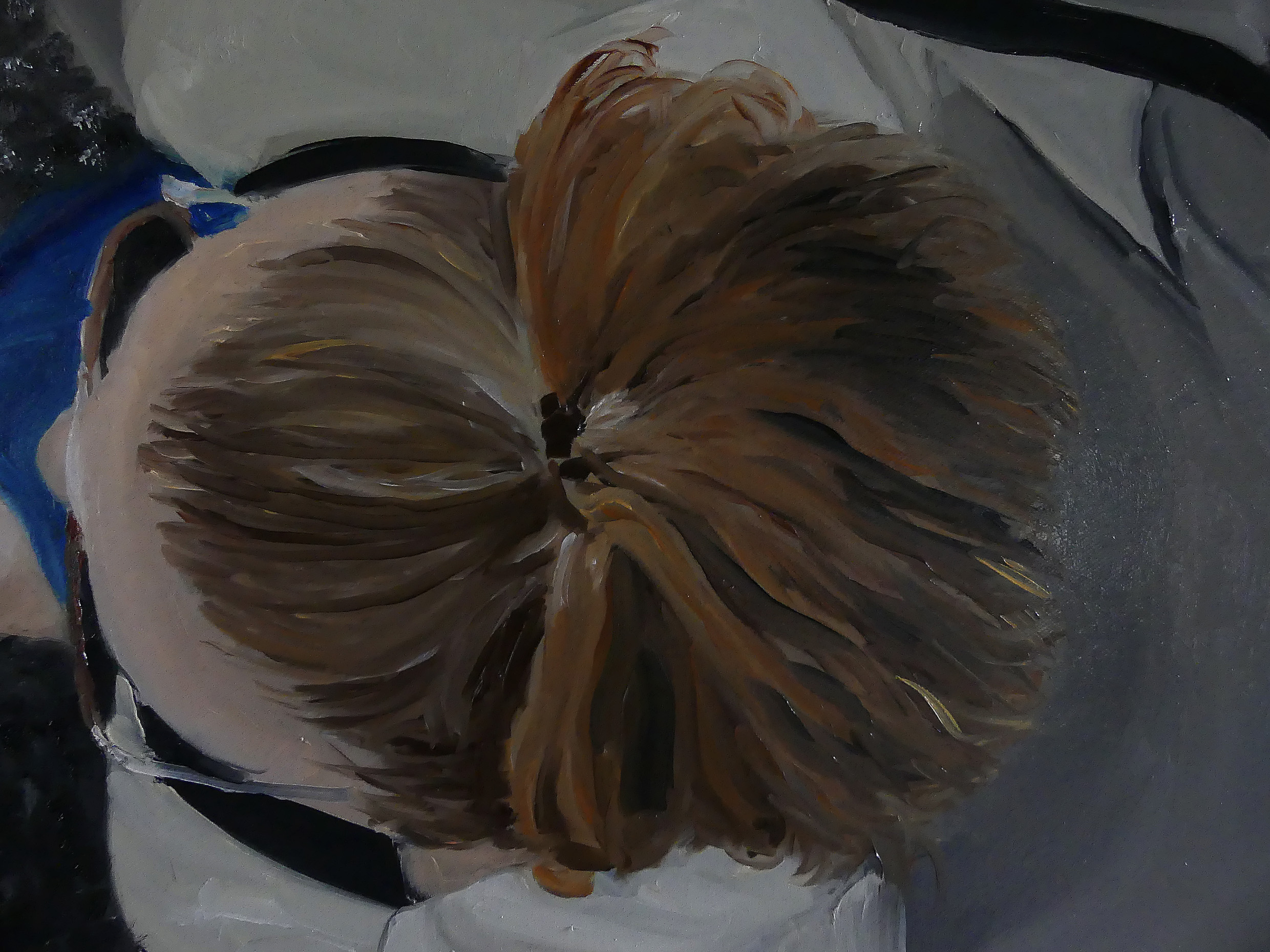 Dieses Gemälde war das Plakat meiner ersten Ausstellung. Draufsicht und Untersicht sind darin vereint. Was sieht sie? Diesen nackten Mann im Rahmen? Die Person, die das Gemälde betrachtet? Eine solche ruhige Intimität einer nackten Frau, die sich die Haare bürstet, und dieser Blick, der zu sagen scheint: Schaust du noch, oder: Hast du immer noch nicht genug? … Das ist, wie man will, eine Frage der Perspektive.