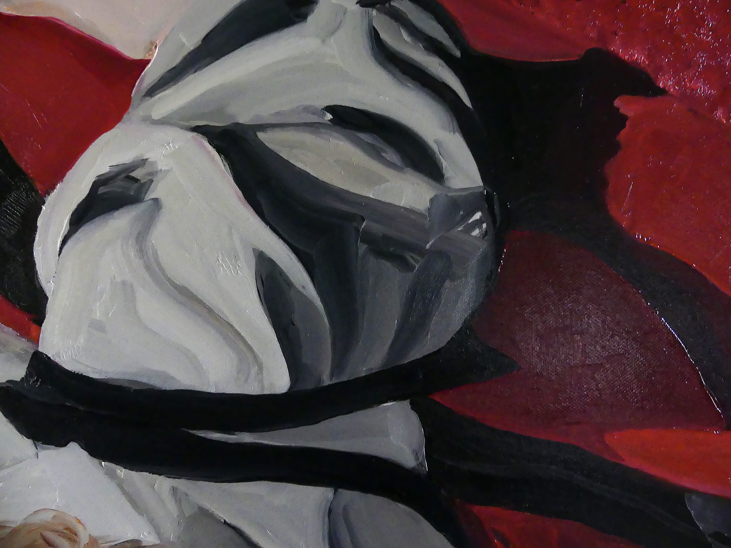 Lucie hat offensichtlich posiert. Aber nicht für mich. Wahrscheinlich für einen Fotografen oder eine Fotografin – ich habe den Autor oder die Autorin nicht gefunden –, denn das Licht, das sie beleuchtet, ähnelt stark einem Blitzlicht. Es definiert das Volumen und lässt die Haut glänzen. Wenn man sich dem Gemälde nähert, erkennt man im Reflex des Objektivs der auf der Kommode stehenden Kamera die Beleuchtungseinrichtung, die Schirme und die Person, die fotografiert! In diesem Hotelzimmer, das mich an die des Hotel Sevilla in Havanna erinnert, hat Lucie mir diesen monströsen und herrlichen Körper gezeigt, der Leben schenkt.