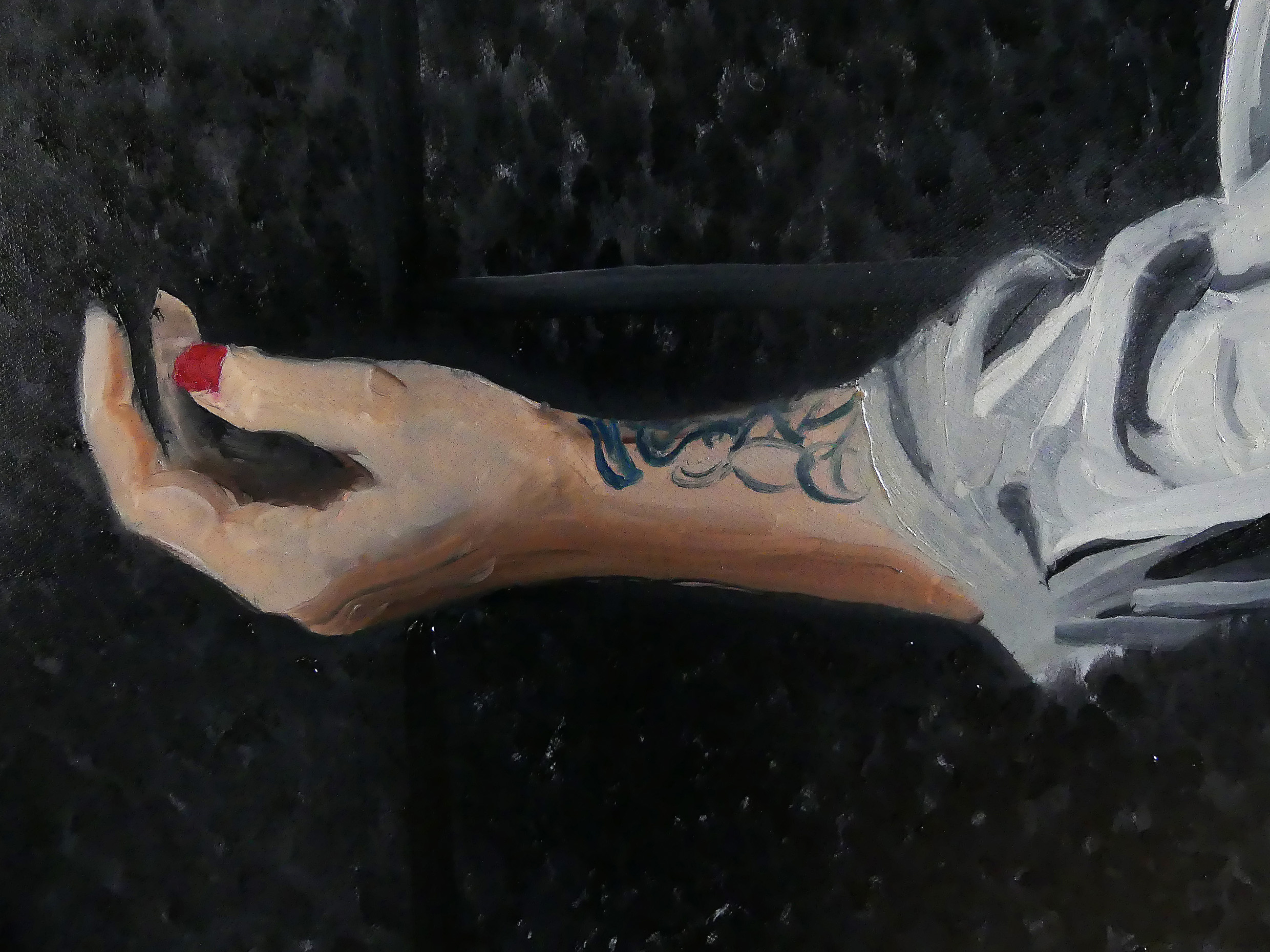 Für mich zeigt die figurative Malerei, im Gegensatz zur fotografischen Darstellung, immer den Moment danach. Die Pose des Modells ist nicht festgehalten und durch den Schnappschuss eingefroren, oder die Malerei ist misslungen, sondern vielmehr im Schwebezustand der Zeit. Einige Fotos schaffen es, selten, aber dann berühren sie die Kunst, nicht eine vergangene, sondern eine zukünftige Sache einzufangen. Vor einem schönen Gemälde habe ich den Eindruck, dass das Ereignis unmittelbar bevorsteht.